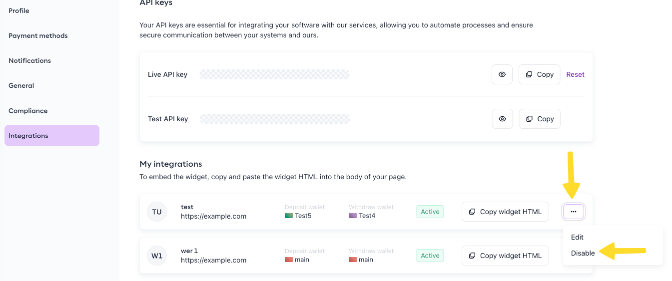 - For the integration you want to disable, click the three dots button and choose Disable from the dropdown menu.