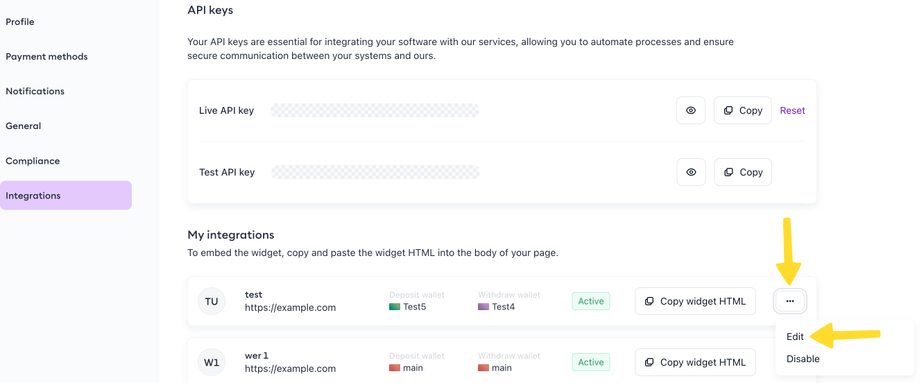 - For the integration you want to edit, click the three dots button and choose Edit from the dropdown menu.