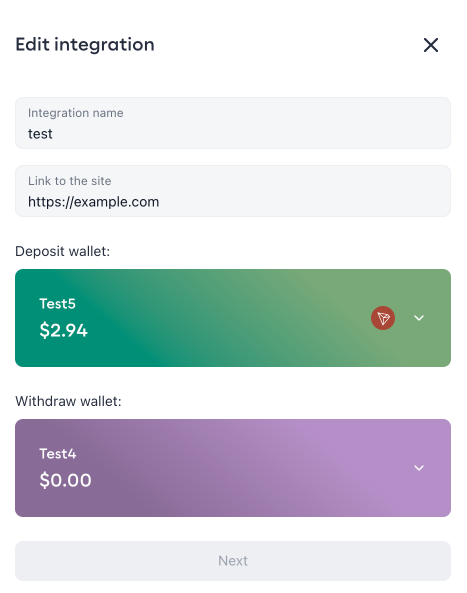 - Withdraw wallet - the wallet used for withdrawals. This wallet will receive funds from withdrawal endpoints (currently in development).