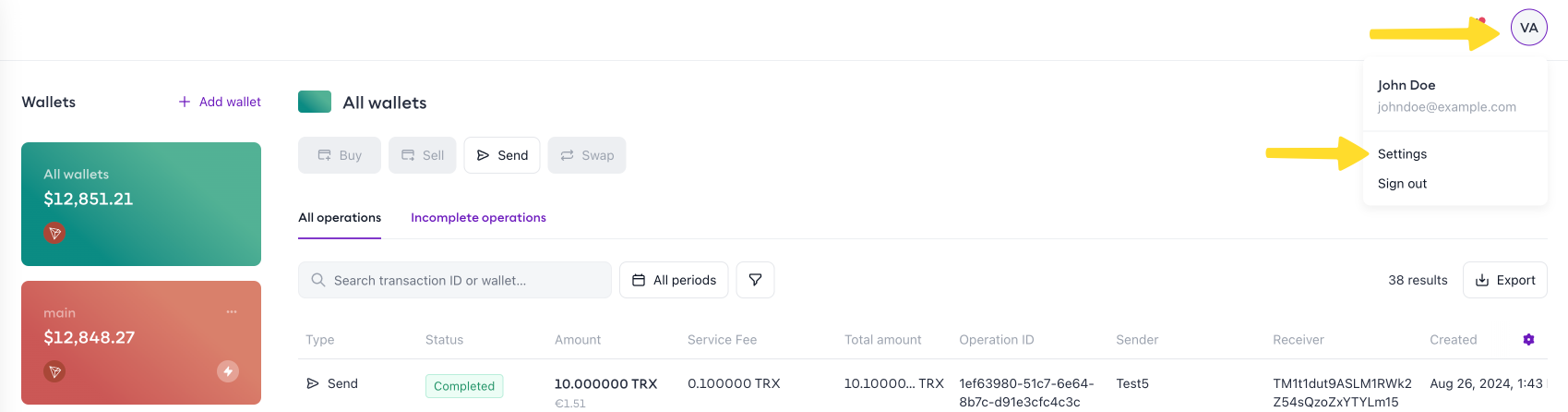 - In the top-right corner, click on the round icon and select Settings from the dropdown menu.