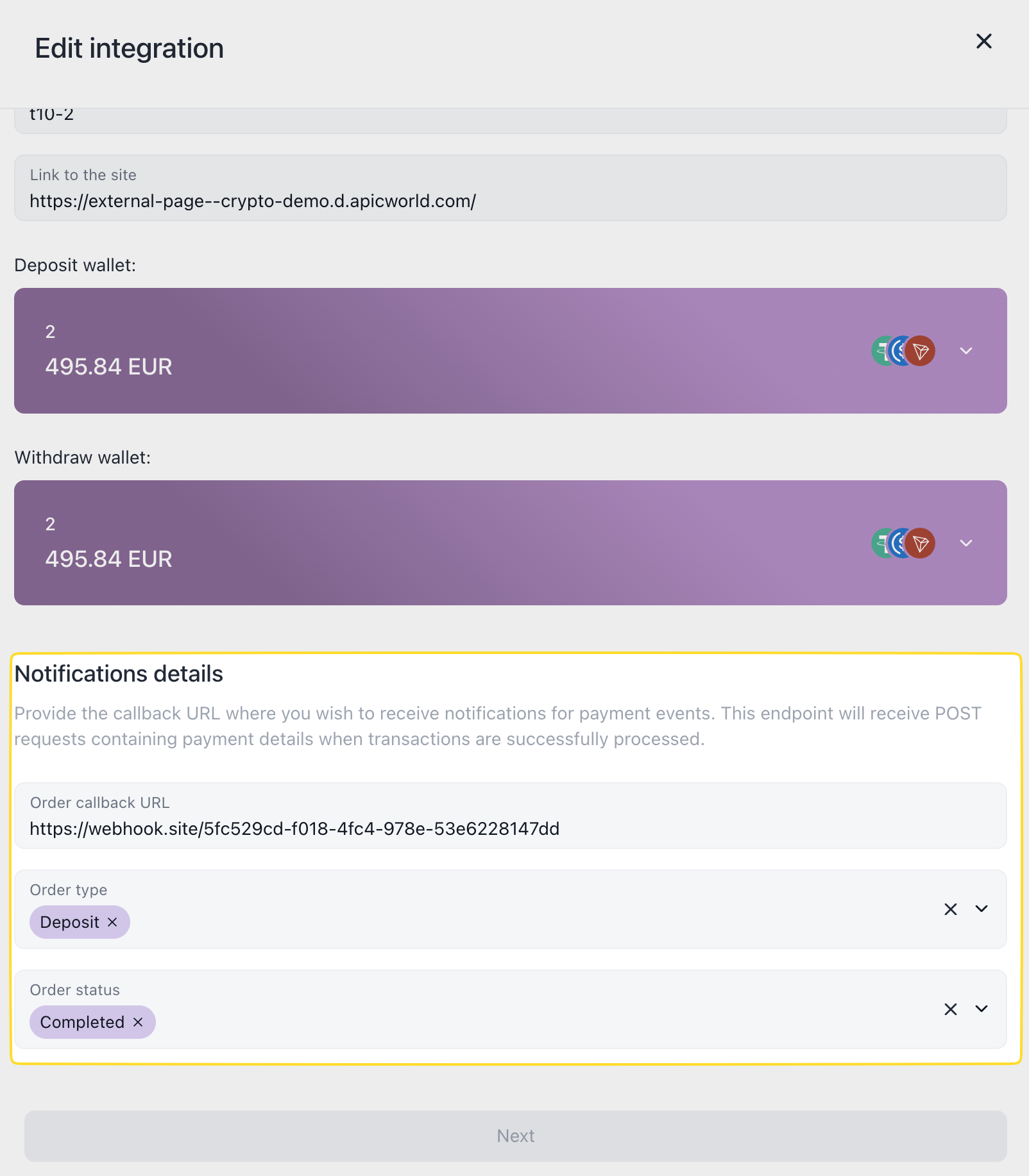 - Testing environment: https://wallet--crypto-demo.d.apicworld.com